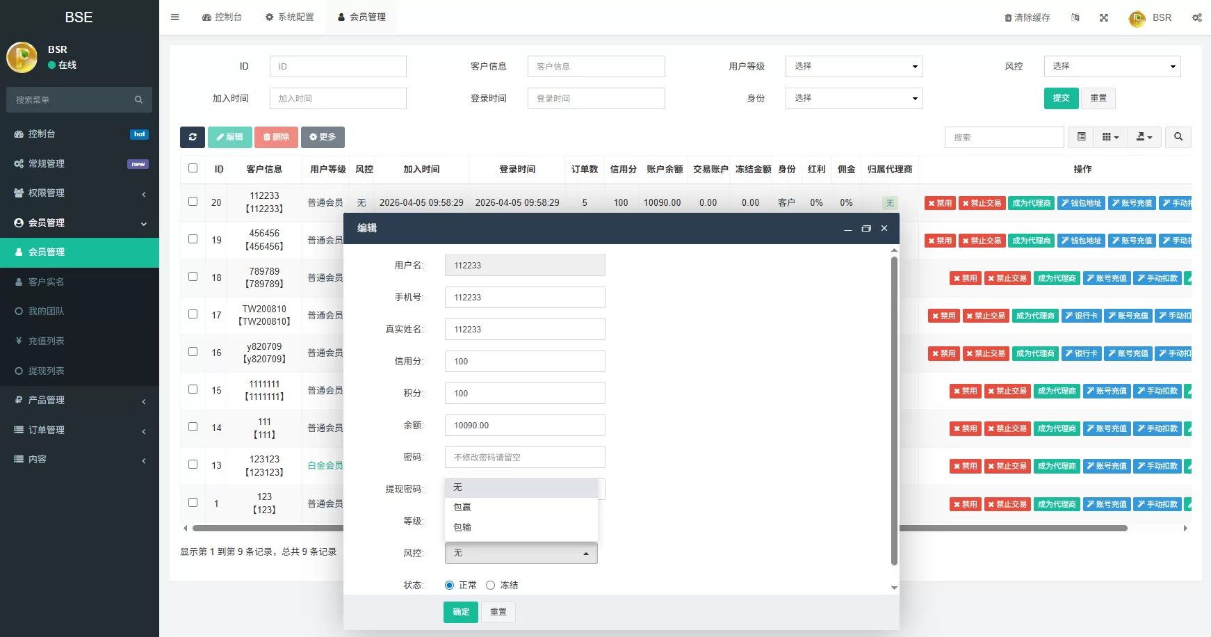 系统功能:信用分,实名认证,usdt充值提现,用户单控,订单控制等功能